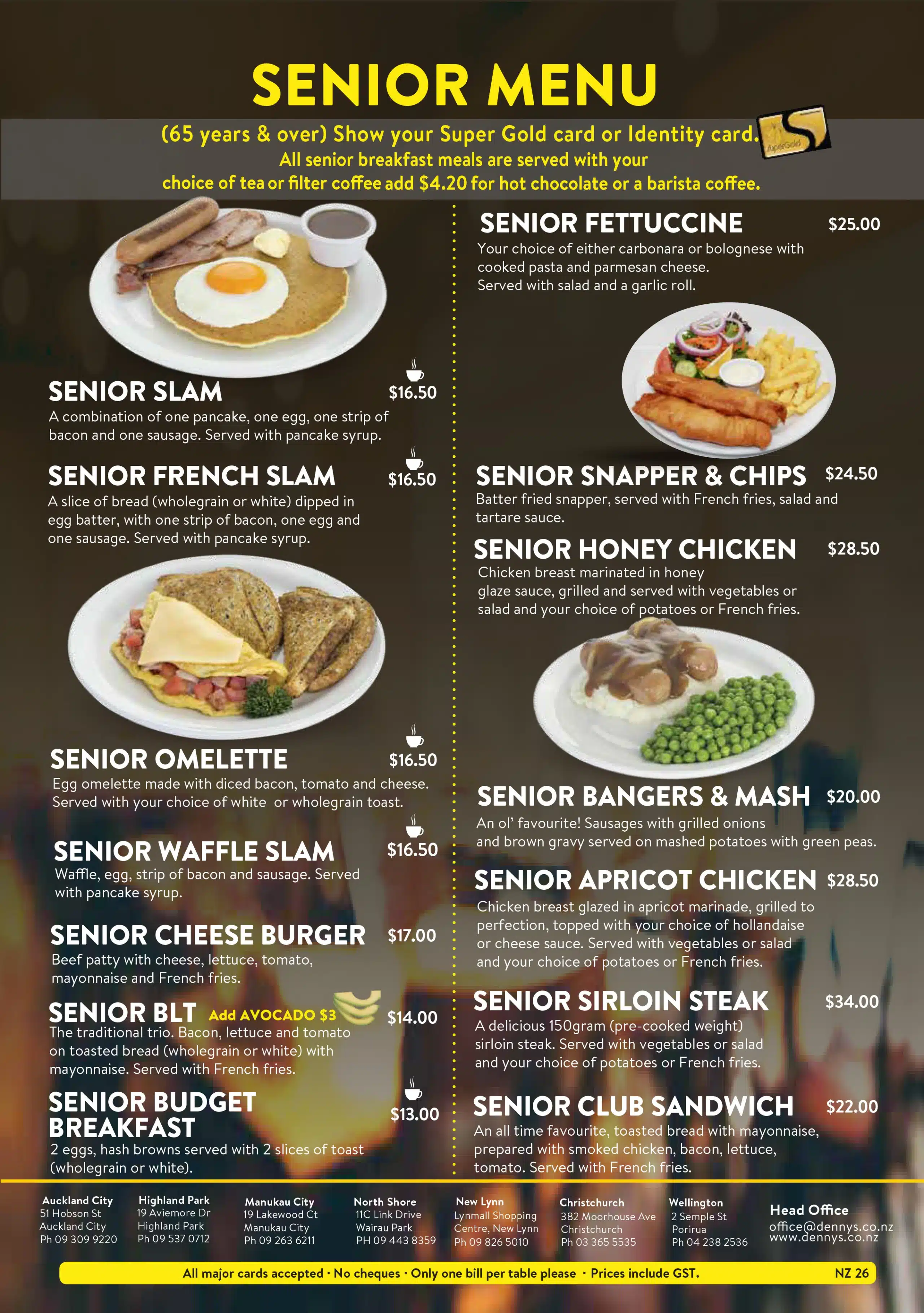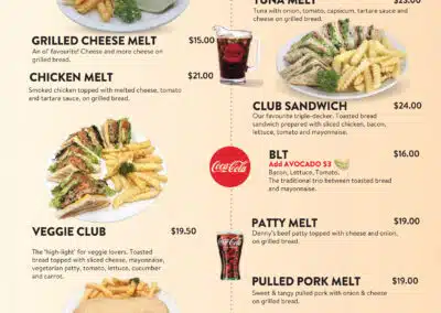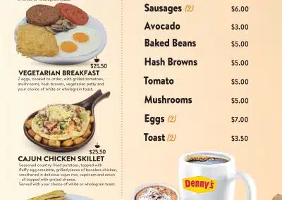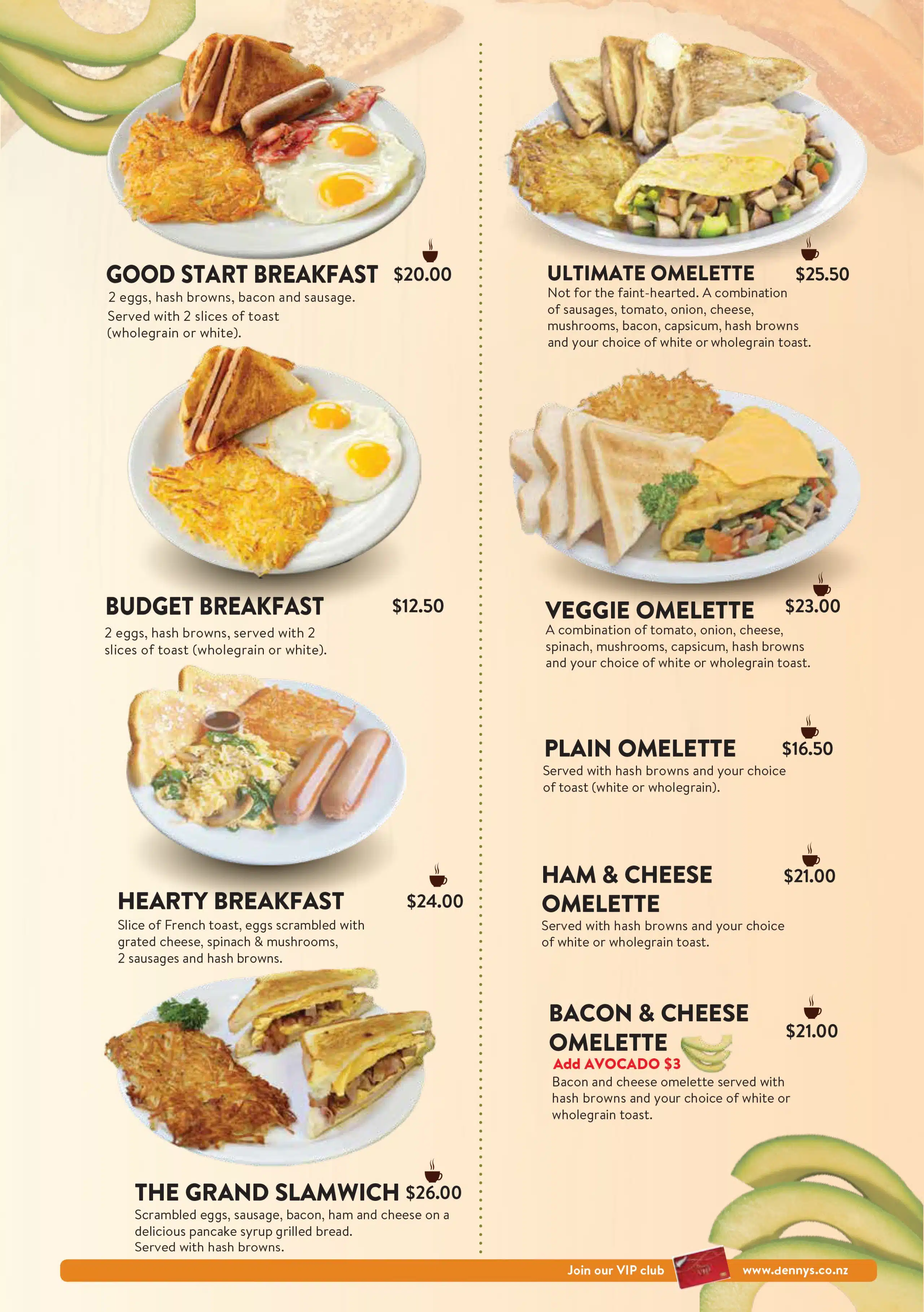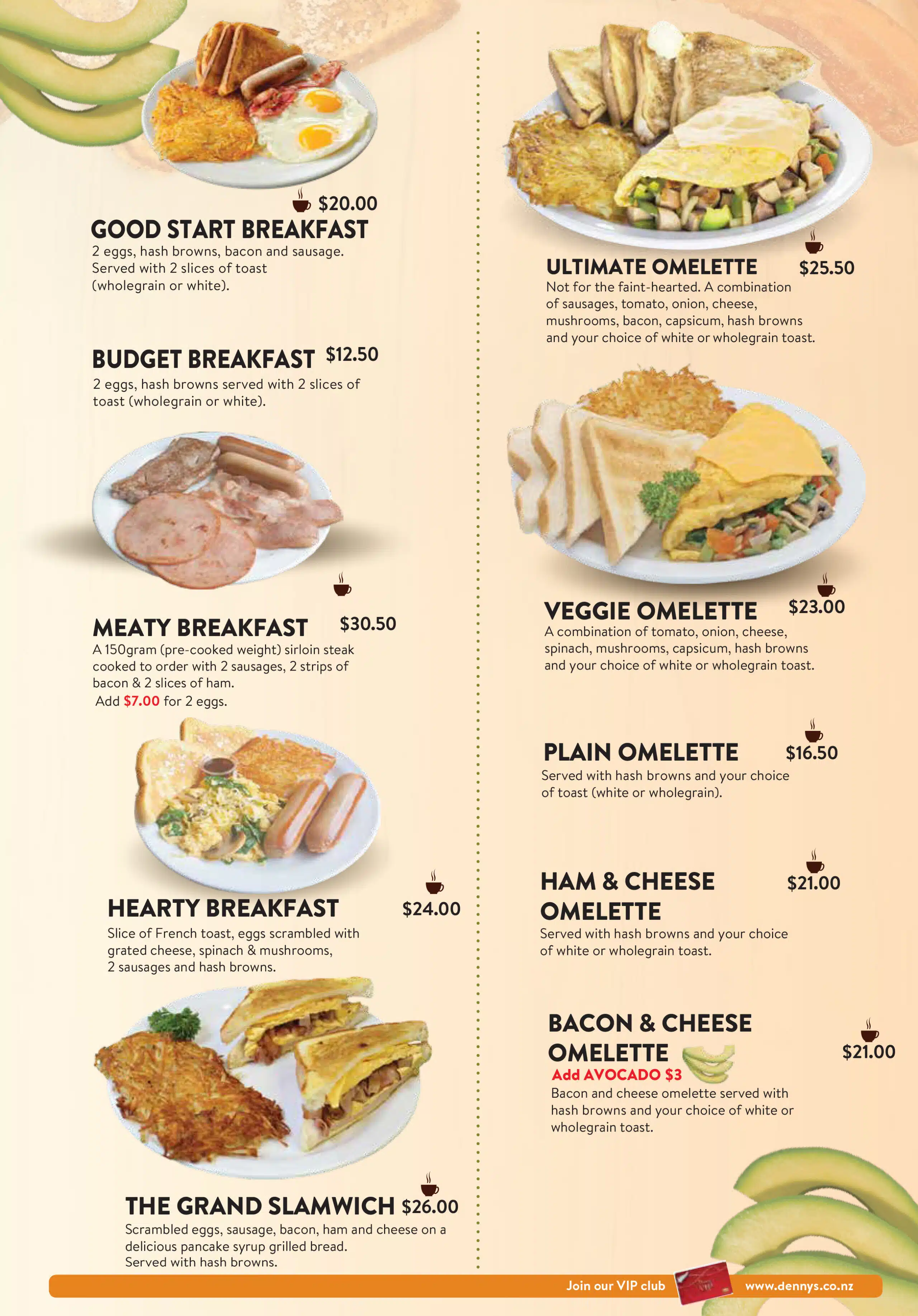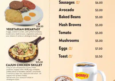 menu What are you hungry for? Dennys MenuBreakfast Appetizers Vegetarian Main MealsSandwiches & Burgers Senior MenuKid's Menu DessertBar Menu Dennys Menu Breakfast Appetizers Vegetarian Main Meals Sandwiches & Burgers Senior Menu Kid’s Menu Dessert Bar Menu Auckland CBD North Shore Highland Park New Lynn Manukau City Wellington Porirua Christchurch Menu Locations Company Connect Careers Contact us VIP Application Form Rewards FAQs New Promotions